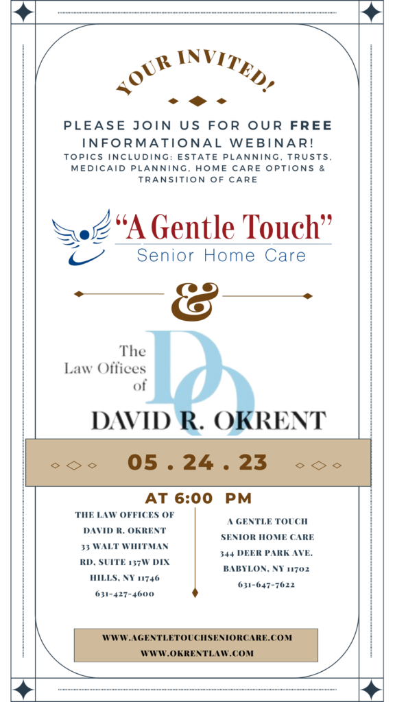 Join us for a FREE informational Webinar with topics including: Estate Planning, Trusts, Medicaid Planning, Home Care Options, Transition of Care.