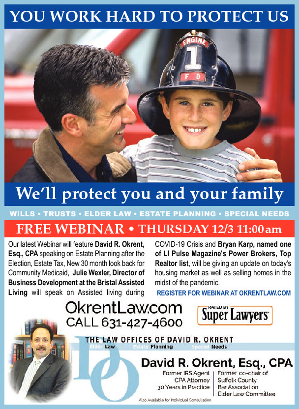Our latest Webinar will feature our own David R. Okrent, Esq., CPA speaking on Estate Planning after the Election, Estate Tax, New 30 month look back for Community Medicaid, Julie Wexler, Director of Business Development at the Bristal Assisted Living will present on when to make the decision to make a move from the family home and the continuum of senior living options and Bryan Karp, named one of LI Pulse Magazine’s Power Brokers, Top Realtor list, will be giving an update on today’s housing market as well as selling homes in the midst of the pandemic.